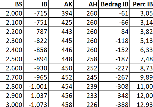 (BS: Bruto salaris. IB: Inkomstenbelasting. AK: Arbeidskorting. AH: Algemene heffingskorting. Bedrag IB: bedrag inkomstenbelasting. Perc. IB: percentage inkomstenbelasting.)