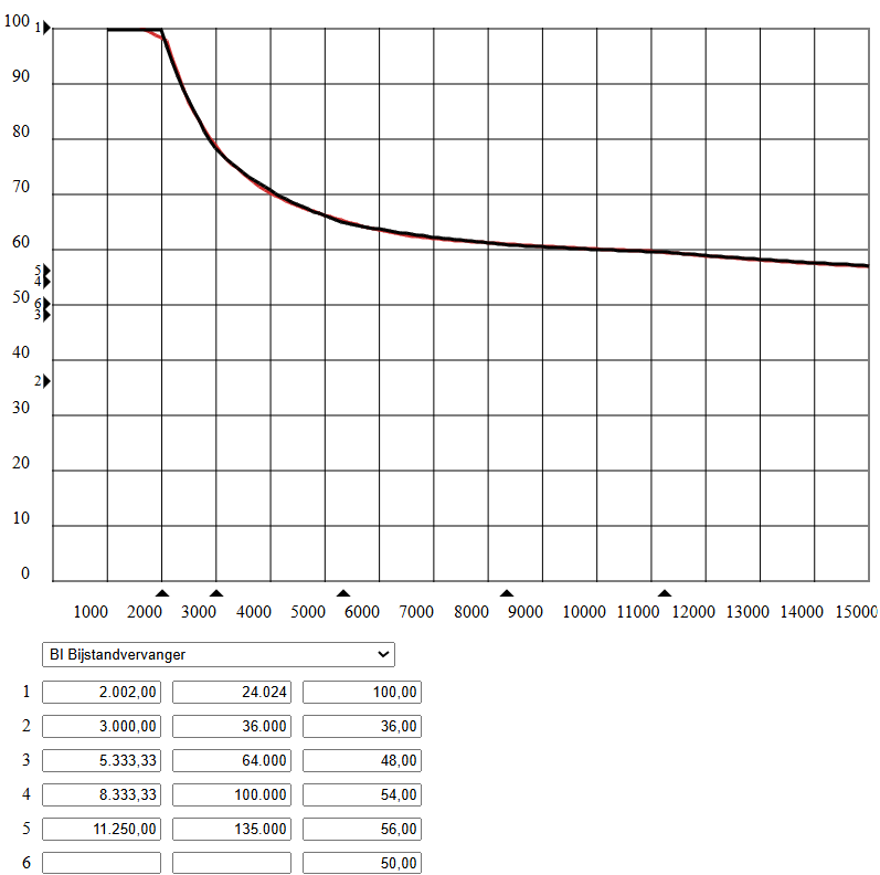 Met de driehoeken of via de tekstvakken onder kunnen de percentages en bedragen worden aangepast. De zwarte lijn is het resultaat van het schijvensysteem, de rode lijn die van het tabelsysteem.