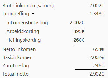 Echter, als twee samenwonenden beide een bruto salaris hebben dat samen 2.002 of hoger is en beide tot 2.002 100% belasting moeten betalen, dan gaan de samenwonenden erop achteruit.